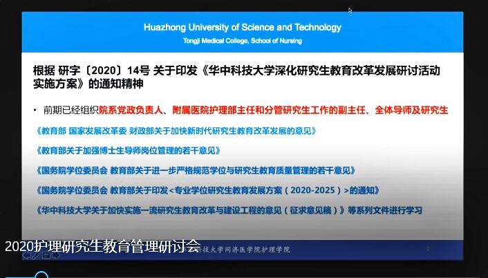 11月5日晚,beat365在线唯一官网通过腾讯会议召开了2020年深化研究生教育改革发展研讨会,会议由党委书记徐晖主持。beat365在线唯一官网院长毛靖、附属同济医院、附属协和医院、附属梨园医院的护理部主任和分管研究生工作的领导及导师代表参加会议。