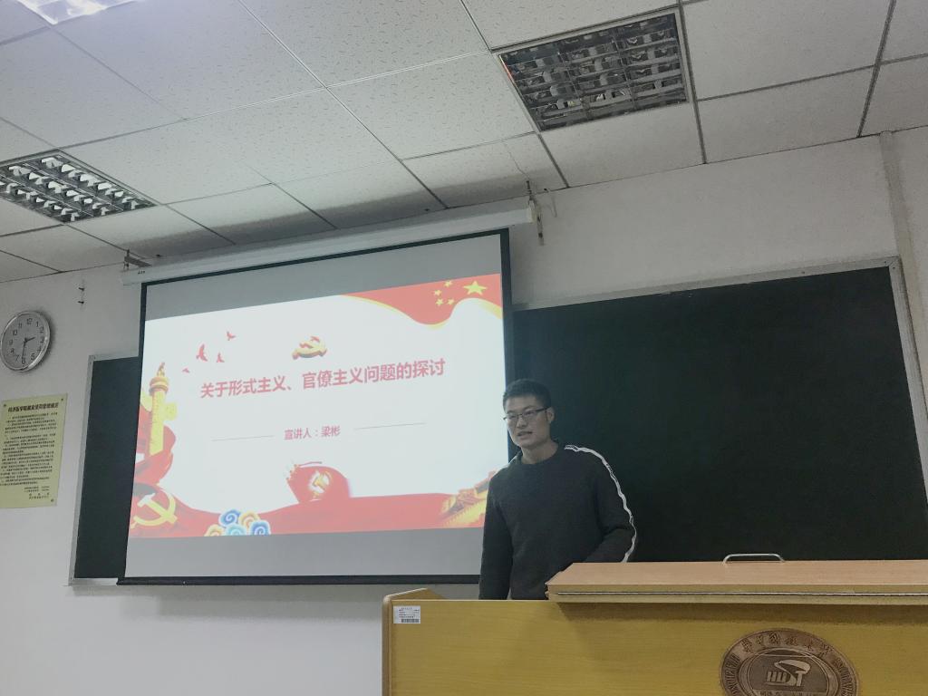 近日,中纪委办公厅印发了《关于贯彻落实习近平总书记指示精神集中整治形式主义、官僚主义的工作意见》,全面启动了集中整治形式主义、官僚主义工作,再次表明了党中央坚定不移全面从严治党、持之以恒正风肃纪的鲜明态度和坚定决心。12月21日,beat365在线唯一官网研究生党支部邀请beat365在线唯一官网哲学系梁彬同学讲授微党课,站在新的起点上对作风建设作出再动员、再部署、再深化的学习。