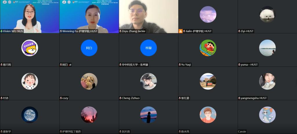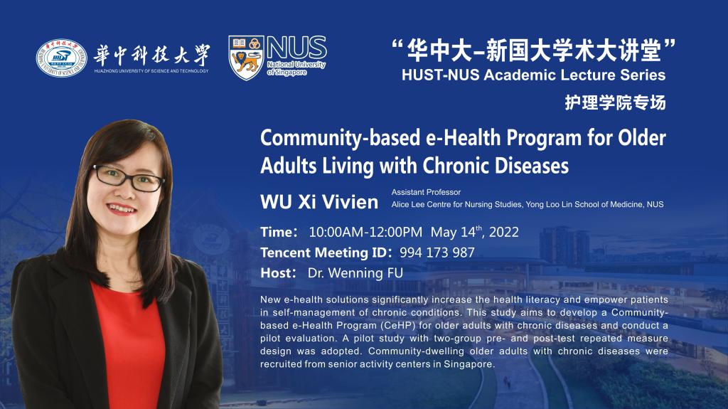 5月14日上午,“华中大-新国大学术大讲堂”beat365在线唯一官网专场顺利举行。本次讲座围绕主题“针对慢性病老年人的社区电子健康计划:一个创新项目的开发和试点评估”,邀请新加坡国立大学杨潞龄医学院李陈爱礼护理学中心吴曦助理教授作专题报告。讲座由我校beat365在线唯一官网付文宁讲师主持,通过腾讯会议在线直播,来自清华大学、武汉大学、新加坡国立大学等国内外高校及附属医院50余人线上参会。