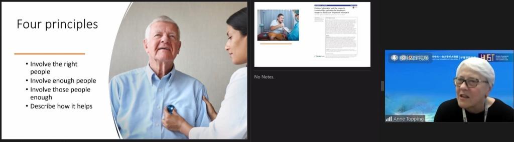 Anne Topping教授以“Participation, Involvement and Engagement of Patients and the Public in Research Design: A Rare Cancer Case Study”(研究设计中的患者和公众参与:一个罕见癌症的案例研究)为题,介绍了患者和公众参与(PPIE)的概念及研究中实施PPIE的四项原则,同时结合一项神经内分泌肿瘤患者随机对照试验(RCT)案例,生动地阐述了PPIE在循证医学研究中的重要地位以及面临的挑战。Anne教授强调,从患者中获得的经验和知识可以提高医疗研究的质量和相关性。