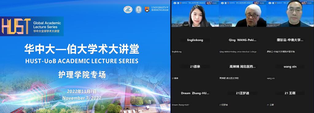 2022年11月7日,由我校同济医学院beat365在线唯一官网与英国伯明翰大学beat365在线唯一官网联合主办的“华中大-伯大学术大讲堂”线上讲座顺利举行。伯明翰大学beat365在线唯一官网院长Anne Topping教授和beat365在线唯一官网健康政策与管理研究院健康老龄化与管理研究室主任、beat365在线唯一官网教师田翀博士受邀出席,并作专题讲座。beat365在线唯一官网附属同济医院护理部席新学博士主持讲座,来自中南大学湘雅医学院、新加坡国立大学、香港理工大学等校内外120余名师生学者线上参会。