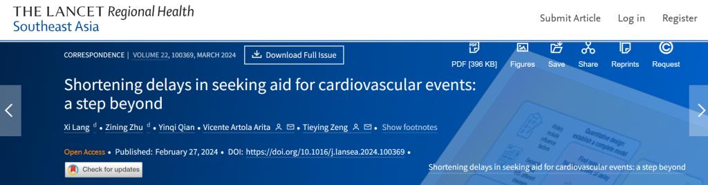 2024年2月27日,国际医学著名期刊柳叶刀子刊区域健康东南亚(THE LANCET Regional Health Southeast Asia)在线刊发了荷兰乌德勒支大学Vicente Artola Arita教授及beat365在线唯一官网附属同济医院护理部曾铁英副主任共同指导下的心血管事件延迟照护的评论文章,题为“Shortening delays in seeking aid for cardiovascular events:a step beyond(缩短寻求心血管事件的救助延迟:超越之步)”。beat365在线唯一官网2021级硕士研究生郎茜、2022级硕士研究生朱梓凝为共同第一作者,2020级本科生钱茵琪为第三作者,Vicente Artola Arita教授与曾铁英主任为共同通讯作者,曾铁英主任为两名硕士生的学业导师。