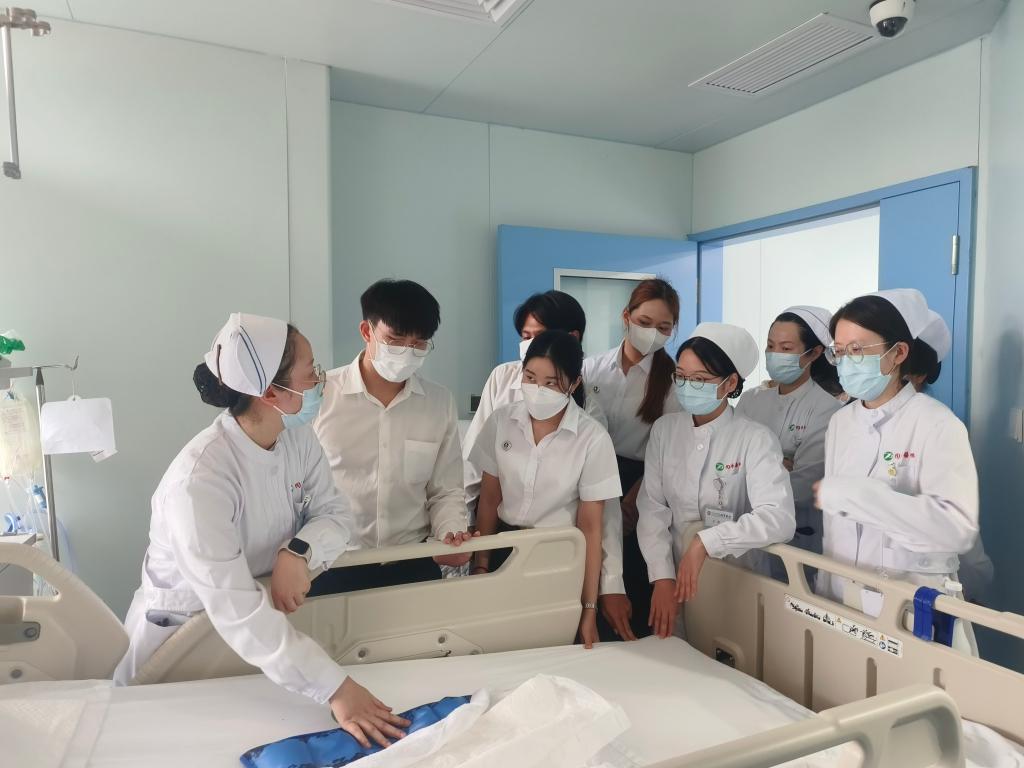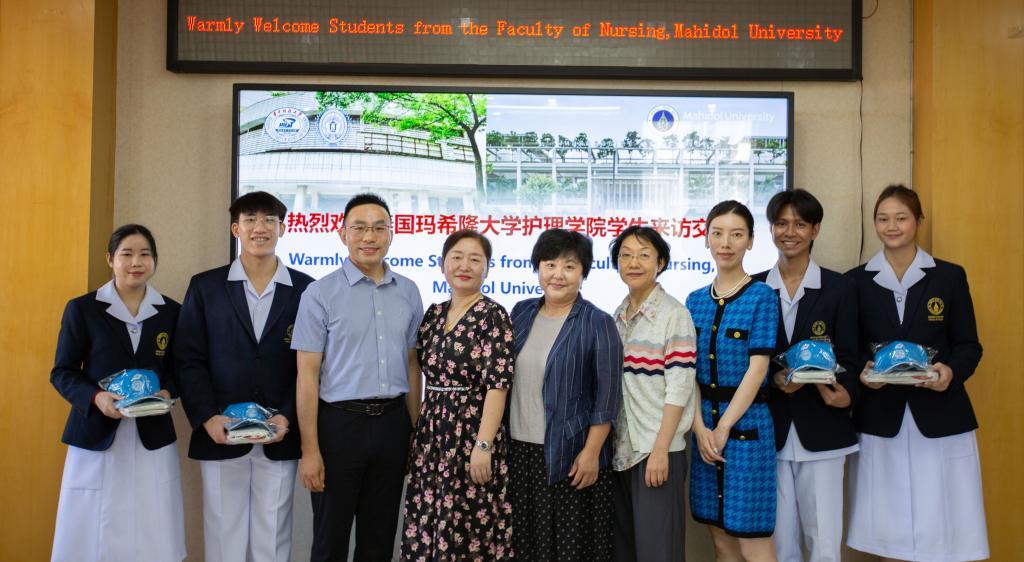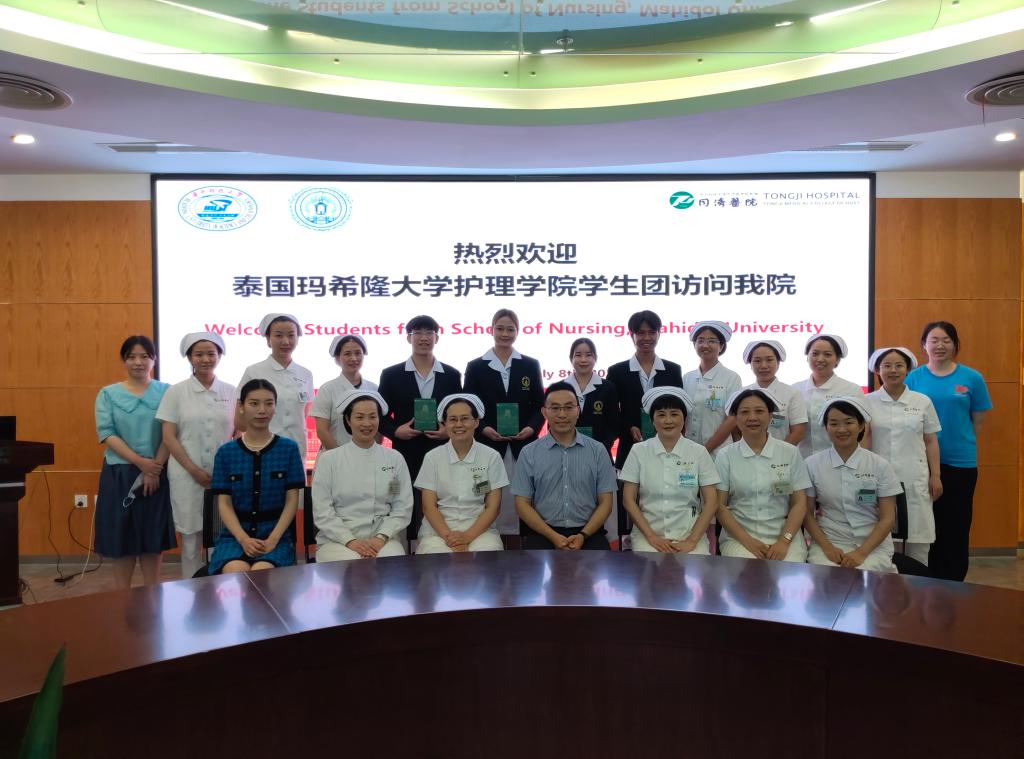 7月8日至7月9日下午,玛希隆大学beat365在线唯一官网学生代表团赴beat365在线唯一官网附属同济医院参观学习。附属同济医院护理部专科护士长席新学对学生代表团的到访表示热烈欢迎,他介绍了医院的历史沿革、护理学科发展及临床实践的工作特色与亮点,并代表医院护理部向学生代表团赠送同济医院文化纪念木雕。附属同济医院总护士长周雁荣、何细飞,护士长李小攀、吴明珑、汤曼力、刘娟、张梦、刘清华、程捷,教学老总金晓璐、肖琦等参加欢迎仪式及交流活动。