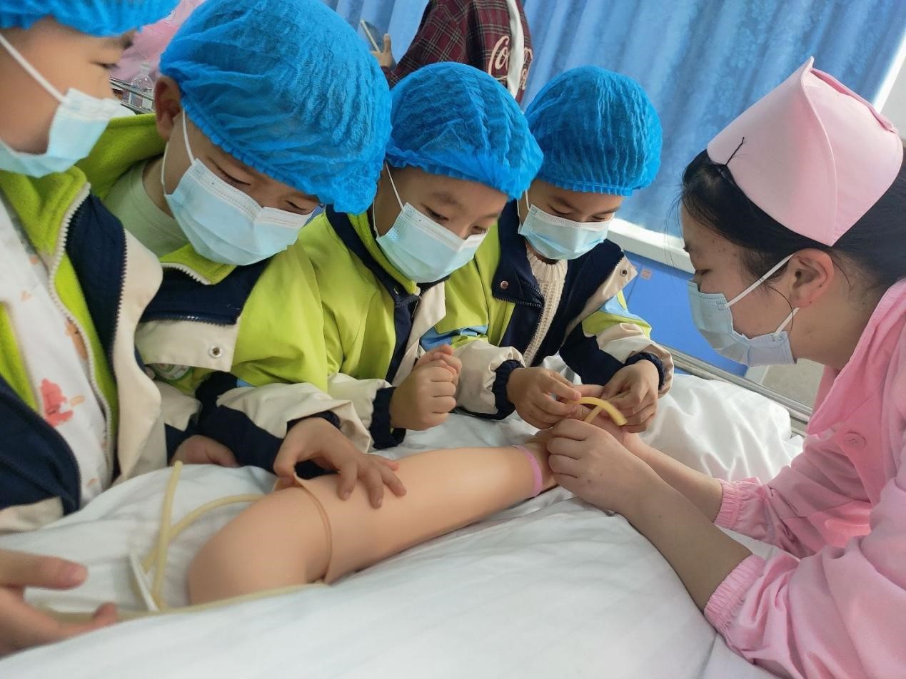 在基础护理学实验室,由本科生团队带领幼儿体验无菌操作流程,观摩护理实训课堂,感受严谨的医学态度。幼儿穿戴迷你护士装备,学习消毒、包扎等基础技能,体验护理工作的神圣使命。孩子们在角色扮演中展现出的专注态度,印证了生命关怀教育的有效性。
