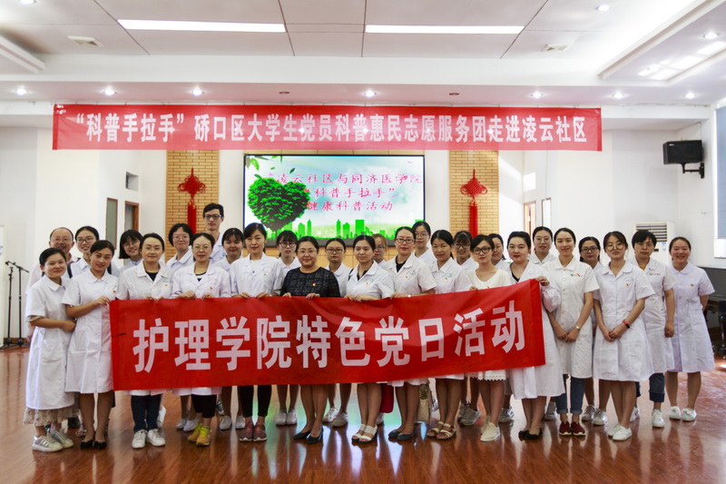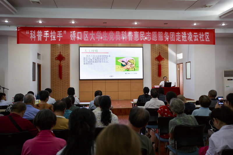在2018年全国科普周之际,为传播急救知识,倡导健康的生活方式,提高居民的生活质量,beat365在线唯一官网党总支组织师生党员走进社区,于9月15日上午在硚口区凌云社区开展科普手拉手活动,为社区居民进行健康知识科普和急救知识培训。beat365在线唯一官网党总支书记徐晖、师生党员共30名师生参加本次活动。