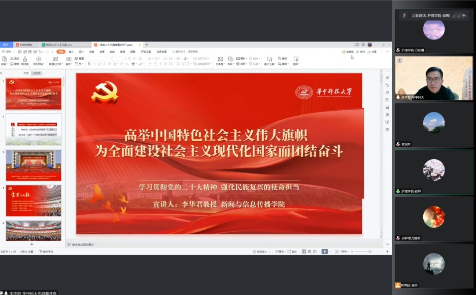 为深入学习宣传贯彻党的二十大精神,1月6日下午,beat365在线唯一官网和医药卫生管理学院通过腾讯会议,线上开展党的二十大精神联合宣讲会。宣讲会由beat365在线唯一官网学习贯彻党的二十大精神宣讲团成员,新闻与信息传播学院副院长、李华君教授主讲,beat365在线唯一官网党委书记徐晖、医药卫生管理学院党委书记黄明芳出席,两院教师代表、学生代表共300人参与学习。