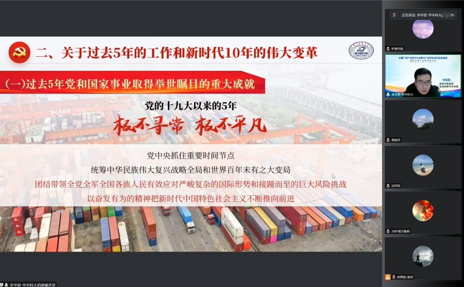 李华君首先概述了中国共产党第二十次全国代表大会的基本情况和主要议程,点明了党的二十大召开的重要意义,并为师生解读了党的二十大主题以及主要成果。随后,李华君梳理了二十大报告中所回顾的过去五年党和国家事业取得的重大成就及新时代10年的伟大变革,结合报告中关于马克思主义中国化时代化的内容,阐释了中国式现代化的中国特色、本质要求和重大原则。