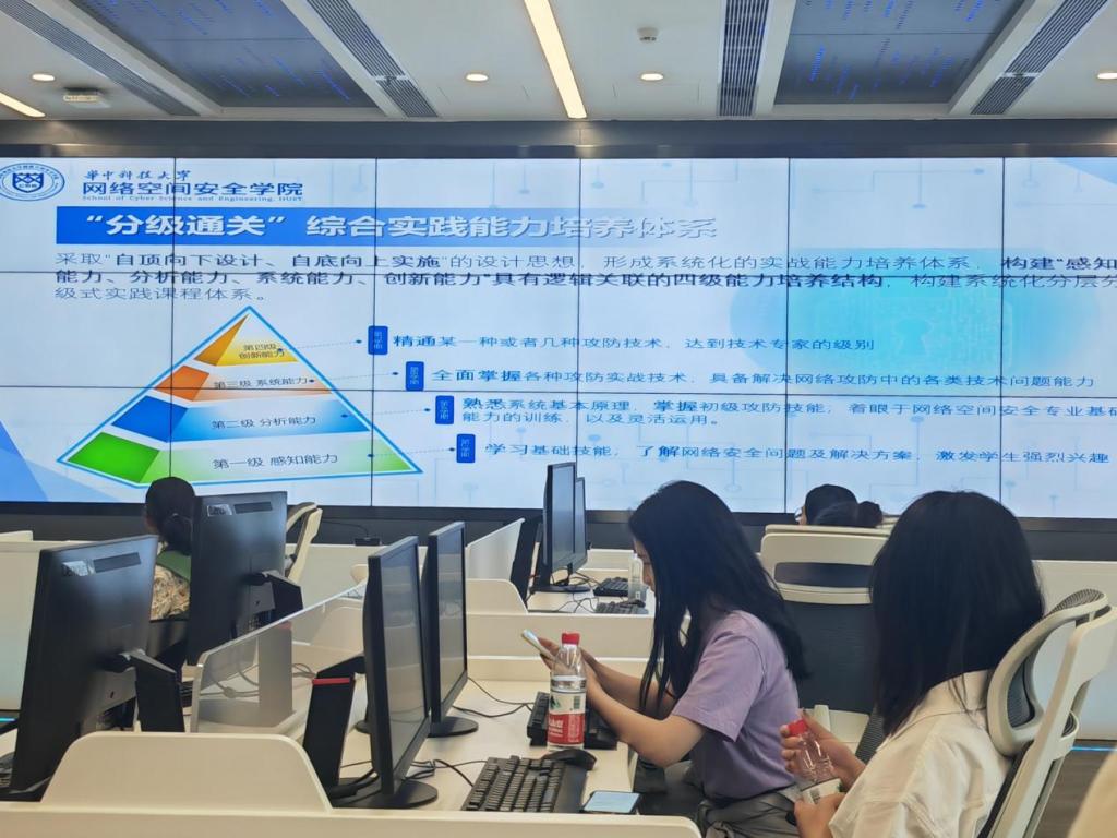 在去往黄鹤网络靶场的过程中,大家参观了网安的人才培养展区,了解了beat365在线唯一官网网络安全学院的人才培养策略、校企协同实训中心共建企业以及国产化软硬件、自主可控相关课程应用情况介绍。