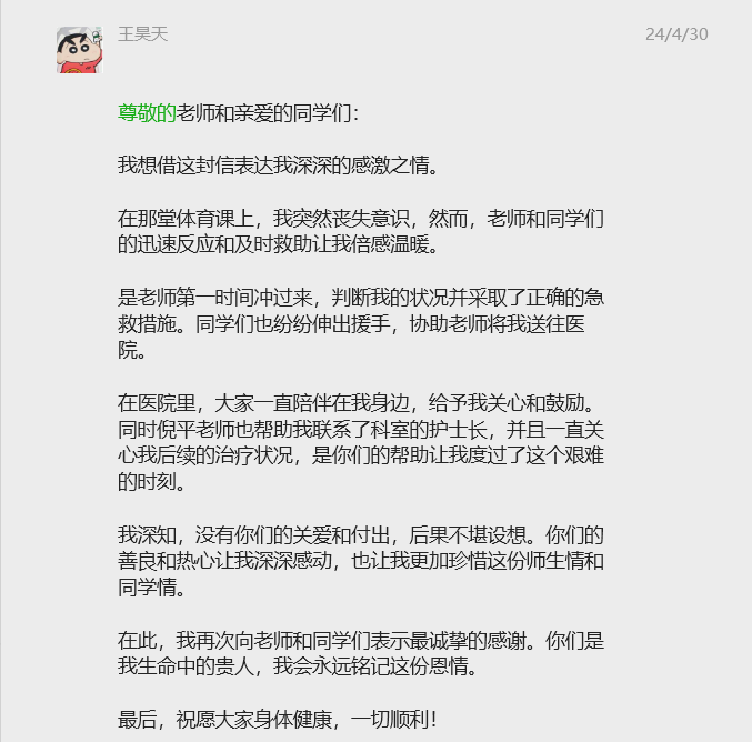 王昊天同学的父母在得知消息后匆匆赶到医院,看到自己的孩子安然无恙,他们流下了感激的泪水。2021级英护班和2021级普护班同学的行动,不仅展现了他们对同学的深厚情谊,更体现了他们面对紧急情况时的冷静和果断。